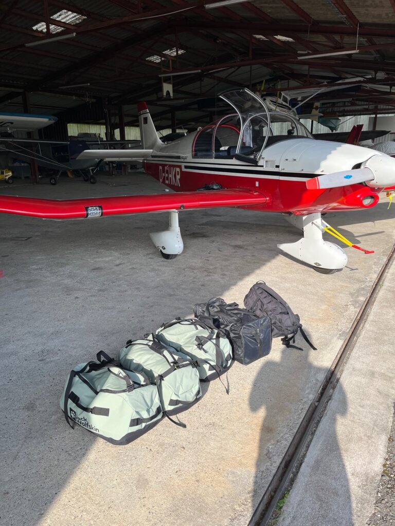 Für Mitte Juni ist es in diesem Jahr außergewöhnlich warm, so auch am Morgen unseres Abflugs. Wir sind schon um 8 Uhr am Platz. Allerdings hatten sich in der Nacht über den Alpen Gewitter entladen. Wolkenreste hängen noch in den Bergen. Unser Abflug wird sich verzögern bis unsere Route mit der Robin fliegbar ist.