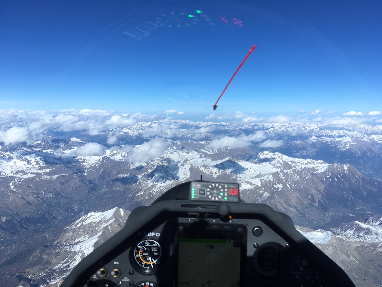 Dann nach Norden bis zum Skigebiet von Sestriere und nochmals bis zum Sperrgebiet im Süden. Danach ist feuchte Luft reingezogen und die Optik hat deutlich nachgelassen. Trotzdem mehrfach perfekte Steigwerte mit 3-6 m/s integriert und nochmals die hohe Basis genossen die ich so hier noch nicht kennengelernt habe. (Mit einem echt geilen Flieger)