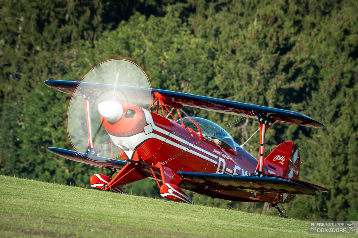 Auch unsere Pitts Model 12, die dieses Jahr zum ersten Mal am Flugtag teilnehmen wird, hat sich ausgetobt, zur Freude des Fotografen im Abendlicht.